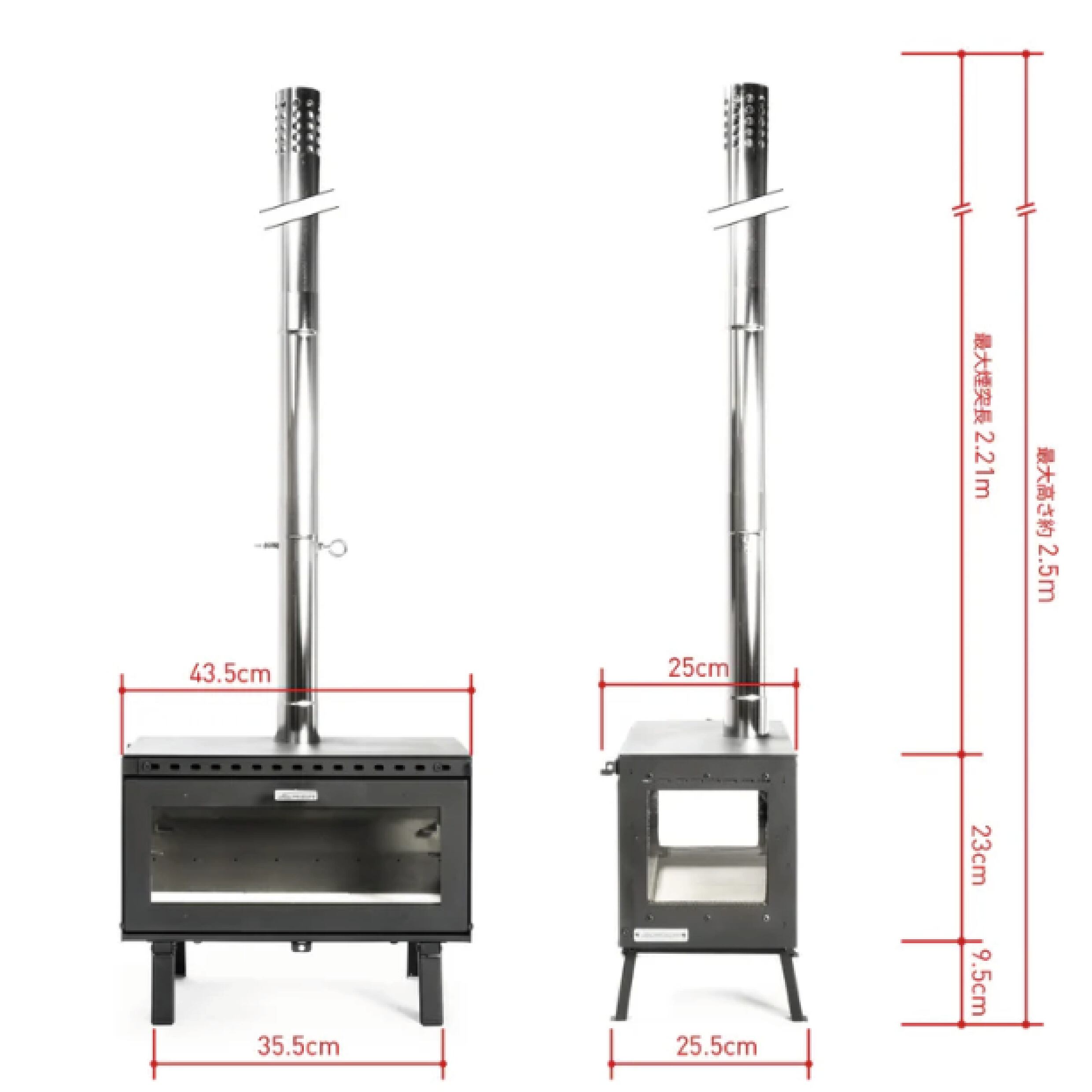 横幅はオーラシリーズと同じ43cm (内寸41cm) とゆとりのある設計で、市販の40cm薪も投入できます。
