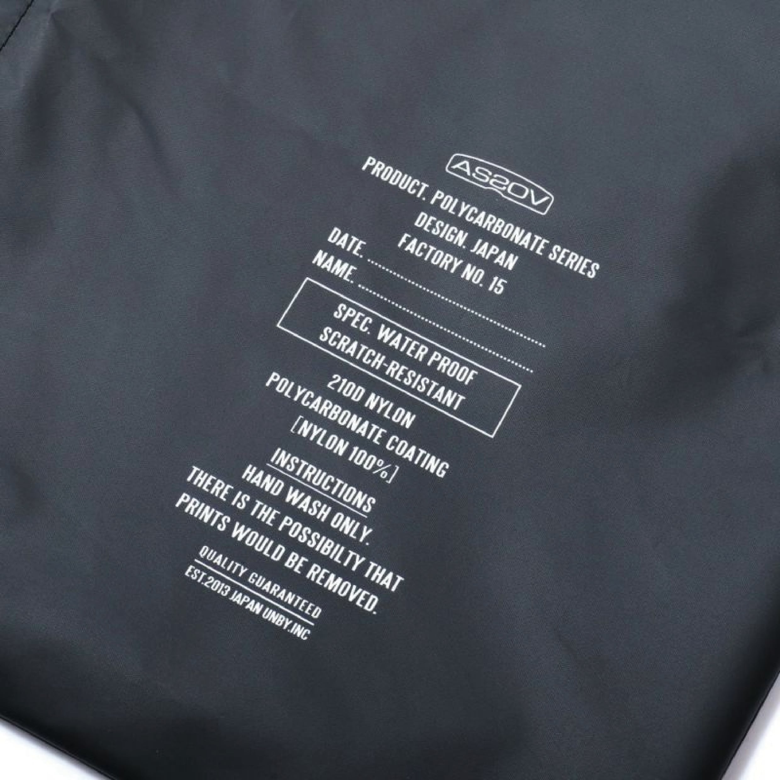 210D ナイロンにポリウレタンを4回、その上に2回ポリカボネートのコーティングを施した生地を使用しています。通常のポリウレタンコーティングに比べ 剥離の耐久性が強く生地自体の防水性の持続性にも優れた、UNBYオリジナルのマテリアルです。