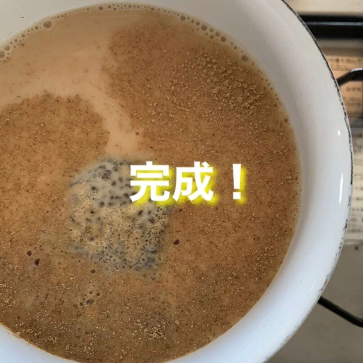 3.5分たったら牛乳200mlとザラメの袋をすべて入れ、再び沸騰するまであたためればあっという間に完成!